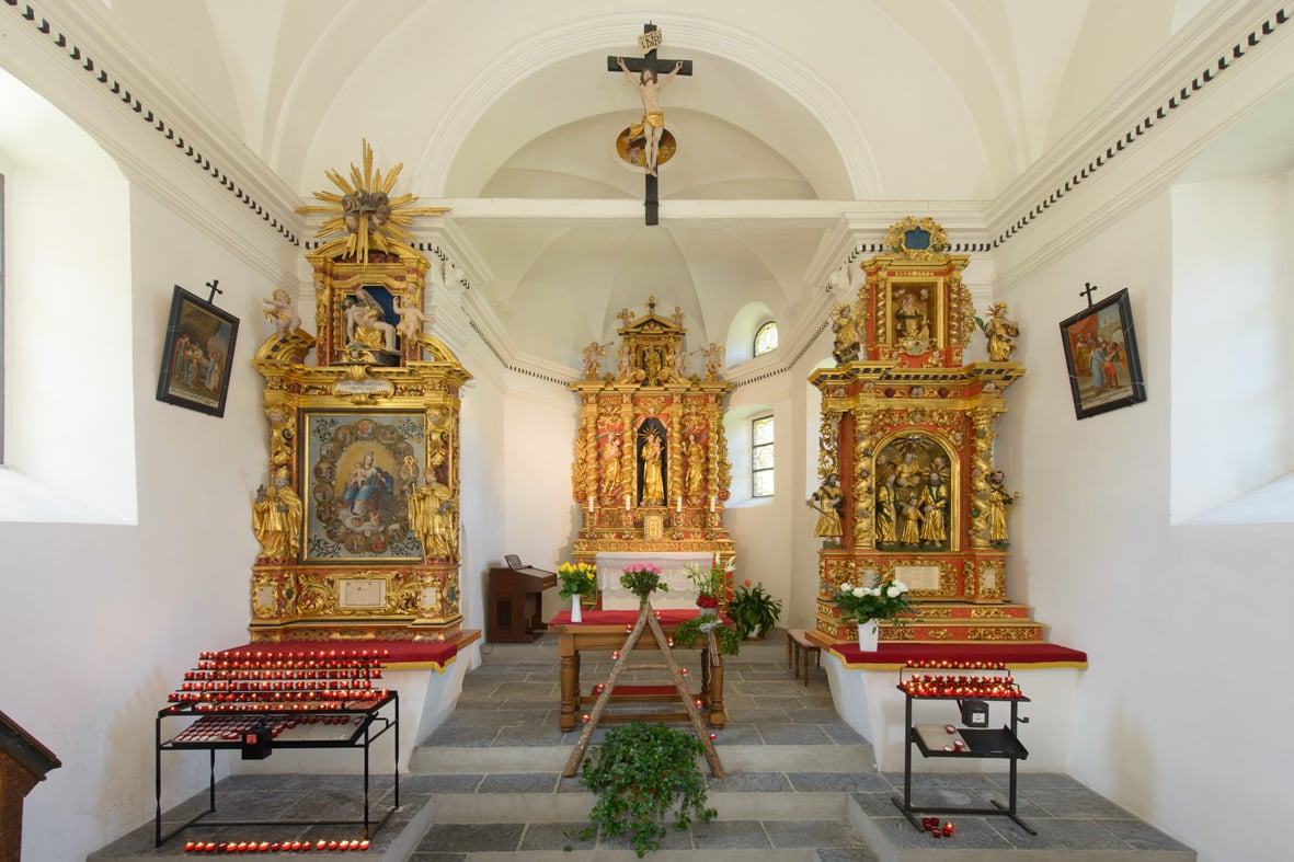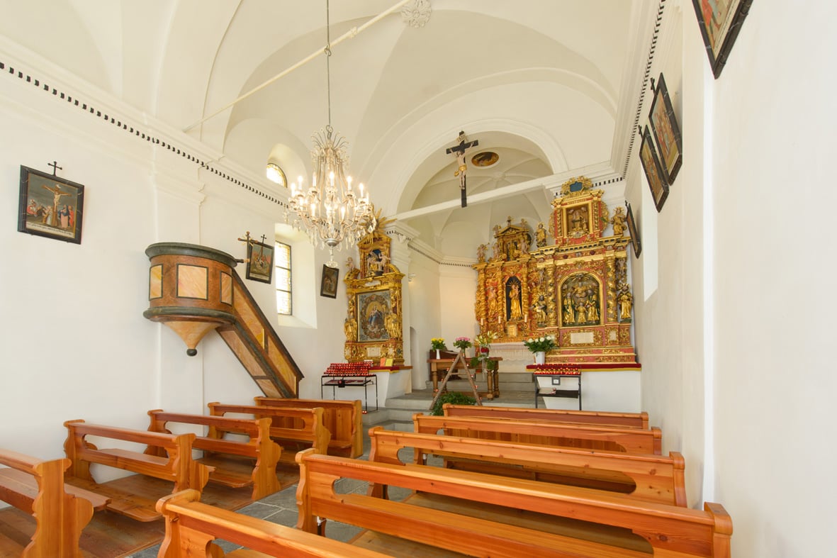Das Innere der Kapelle ist einfach und ganz in weiss gehalten. Die schön vergoldeten qualitätsvollen Barockaltläre stechen von den weissen Mauerflächen stark hervor.