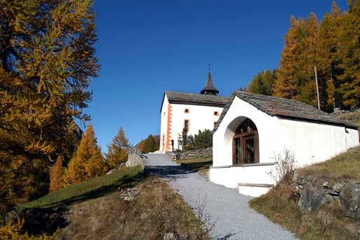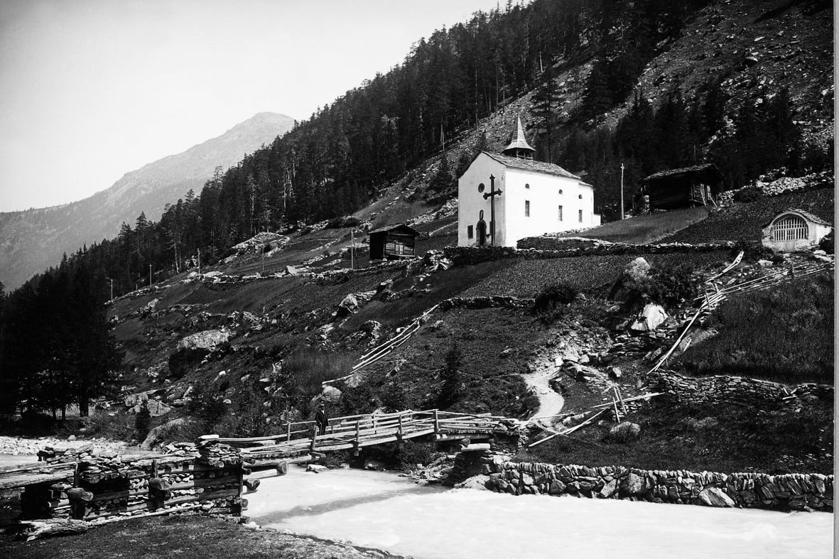 Ihr Standort ist ausserordentlich. Wie ein Riegel steht sie an jener Stelle, wo sich die Talenge hinter Saas-Balen zum breiten Talbecken von Saas-Grund öffnet.