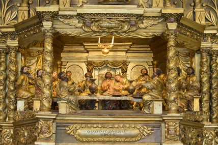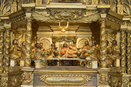 Vom Betrachter aus rechts davon steht eine gotische Statuengruppe aus dem 14. Jahrhundert, die die Anbetung der Heiligen Drei Könige darstellt. Auf der anderen Seite eine Gruppe aus derselben Epoche, die Krönung Marias wiedergebend.