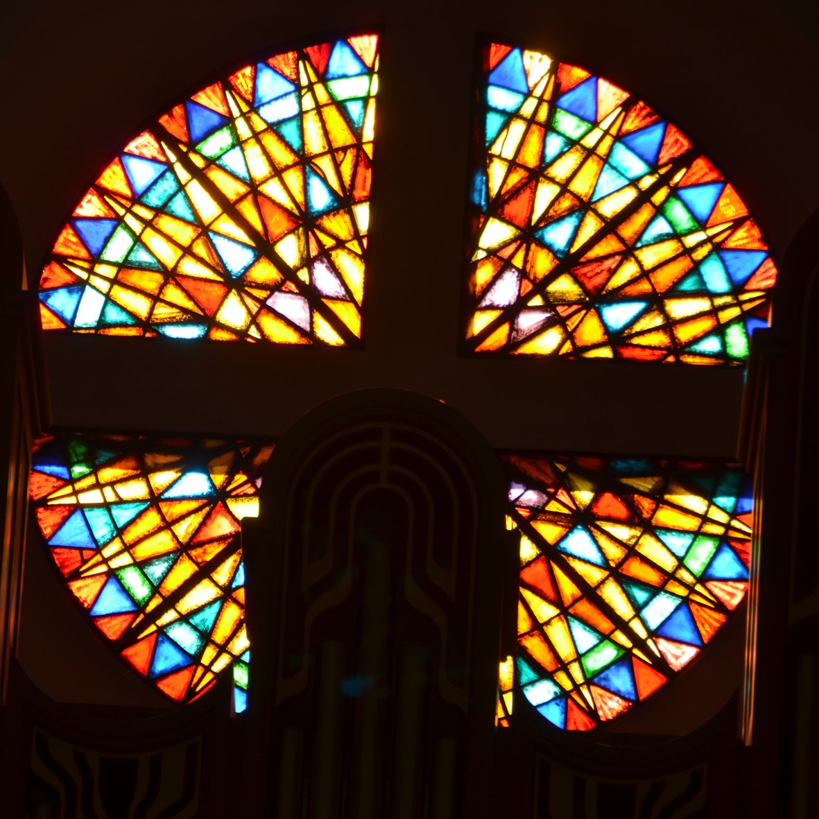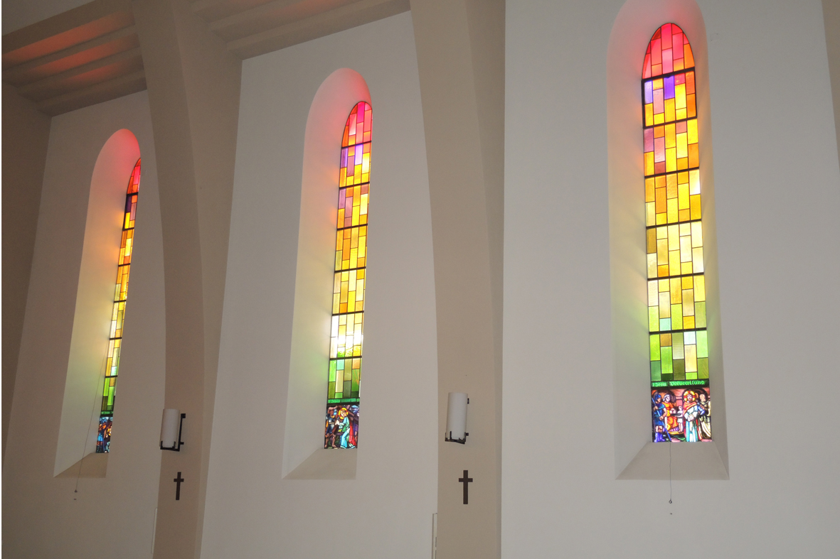 Die Kirchenfenster, ausgeführt von P. Chiara & Fils, Lausanne, bergen in ihren abgestuften Tönen ein eigenes Geheimnis in sich: Das Alpenglühen im oberen Teil kündet das ewige Leben, das Gott schenken will; das erwachende Talgrün in der Mitte will Hoffnung vermitteln auf dem irdischen Lebens- und Leidensweg, den F. Ribas, Lausanne, im Kreuzweg ganz unten farbenfroh schildert. Mit grosszügigen Gaben der zehn Familiengeschlechter von Saas-Grund konnten die eindrucksvollen Kirchenfenster finanziert werden.