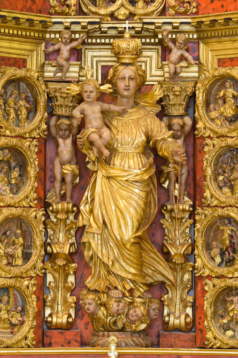 Der Altar auf der linken Seite ist Maria, der Rosenkranzkönigin, geweiht. Sie ist umgeben mit 15 Medaillons, die die Geheimnisse des freudenreichen, schmerzhaften und glorreichen Rosenkranzes darstellen. Auf dem Giebel stehen die Statue des hl. Apostels Petrus (links), bekleidet mit der Tiara als Zeichen der Papstwürde, gegenüber die Statue des hl. Nikolaus von Myra.