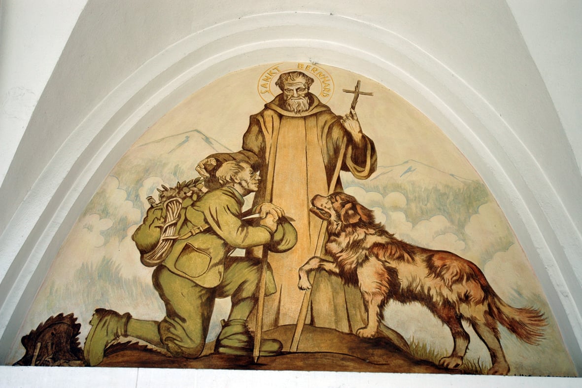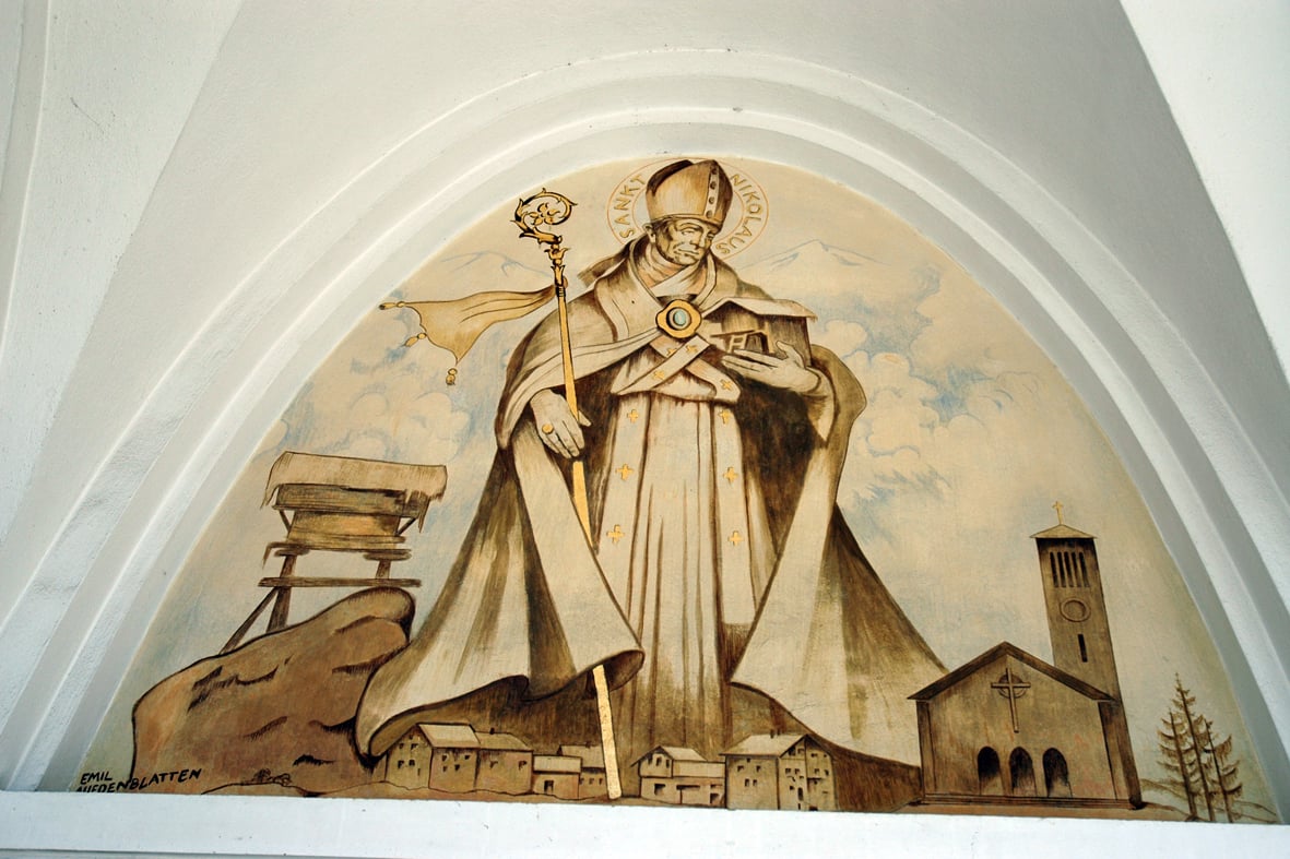 Die Gemälde am äusseren Kirchenportal – sie zeigen den hl. Bernhard von Menthon und den hl. Nikolaus von Myra – , die Bemalung des Chorbogens, in dessen Mitte ein gotisches Kreuz hängt, besorgten die beiden Walliser Künstler Emil Aufdenblatten, Zermatt, und Edmund Imboden, Visp/Herbriggen. Sie wurden in ihrer Arbeit unterstützt vom Kunstmaler Lipinsky aus Rom.