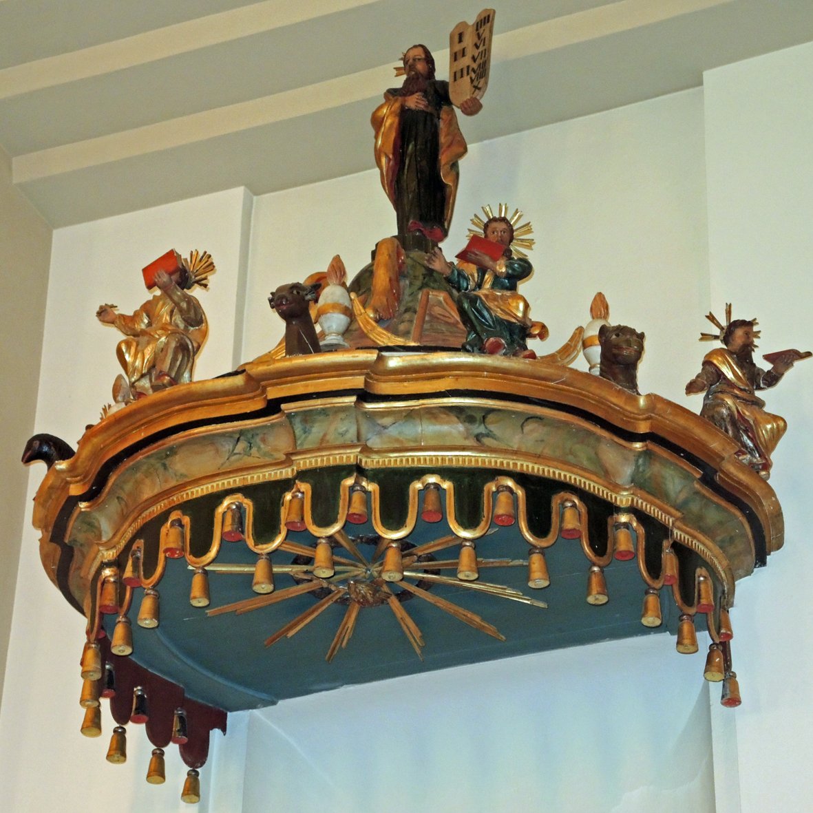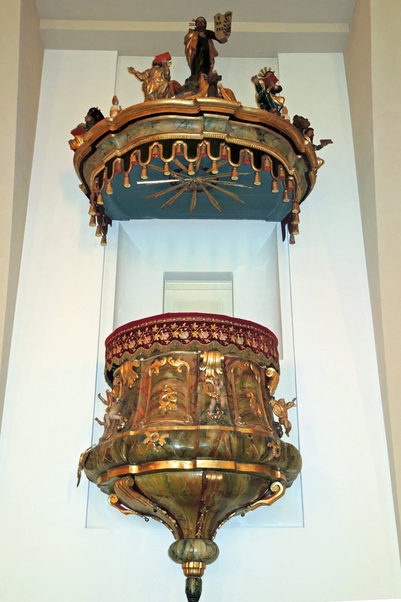 Die Kanzel, auf der man früher predigte, zeigt auf ihrem Dach Mose mit den Gesetzestafeln, umgeben von den vier Evangelisten Matthäus, Markus, Lukas und Johannes. Die Kanzel selbst ist durch vier Puttenengel verziert.