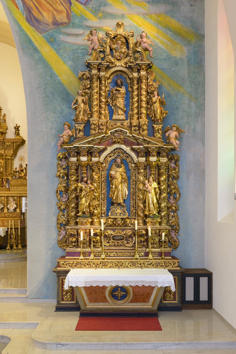 Der rechte Seitenaltar ist dem hl. Mönchsvater Antonius von Ägypten geweiht und stammt aus dem Jahre 1698. Rechts und links wird der Wüstenvater flankiert vom hl. Antonius von Padua und dem hl. Josef, dem Nähr- und Pflegevater Jesu. Beide tragen das Jesuskind auf ihrem Arm. Oben auf dem Gesims stehen von links nach rechts die Statuen des hl. Apostels Petrus, des hl. Völkerapostels Paulus und des hl. Stephanus, des ersten Märtyrers der Kirche. Auch hier werden die beiden seitlichen Statuen von Putten begleitet. Zuoberst am Altar erblickt man die Darstellung von Gottvater.