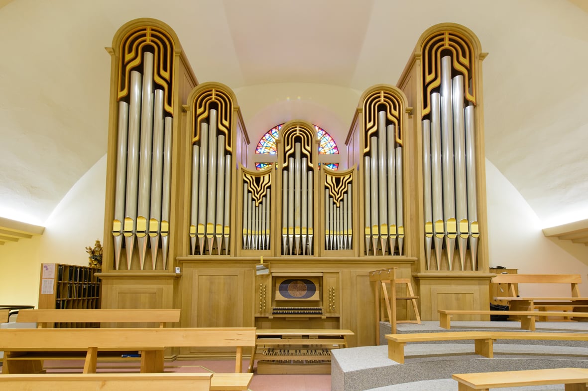 Die Orgel fügt sich nahtlos ins Kirchengebäude ein, strahlt auch mit seinem fünftürmigen Eichholzgehäuse Harmonie aus, ohne dabei das dahinterliegende Rundfenster zu verdecken und Lichteinfall zu brechen.